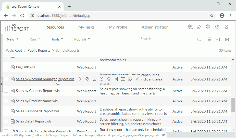You can view the sample reports Server provides in the Public Reports folder in the Resources page of the Server Console, provided that you have the necessary permissions on the reports.
