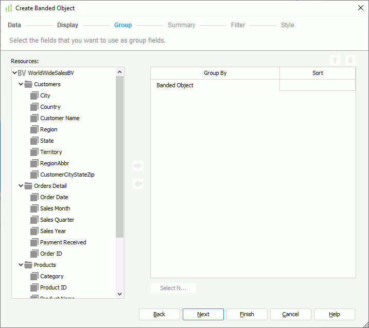 to adjust the display order of the detail fields in the banded object. By default, Designer applies the display names of the added fields to label the corresponding detail columns; to edit the label for a detail column, select in the Display Name text box and type a new name. You can also select Sort Fields By to specify how to sort the detail values the same as you do for a table. - In the Group screen, specify the criteria for grouping the data in the banded object the same as you do for a table.
