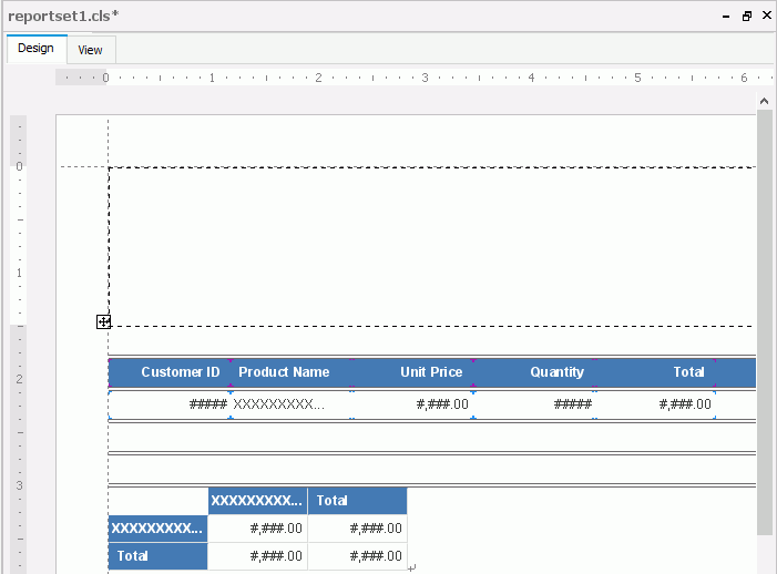 - Insert a crosstab into the report and place it below the banded object. The crosstab shares the same dataset with the banded object, contains the column field Product Type Name, row field Region, and aggregate field Total with the aggregate function Sum, and applies the Classic style too.