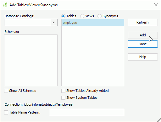 - In the Add Tables/Views/Synonyms dialog box, select the table employee and select Add.