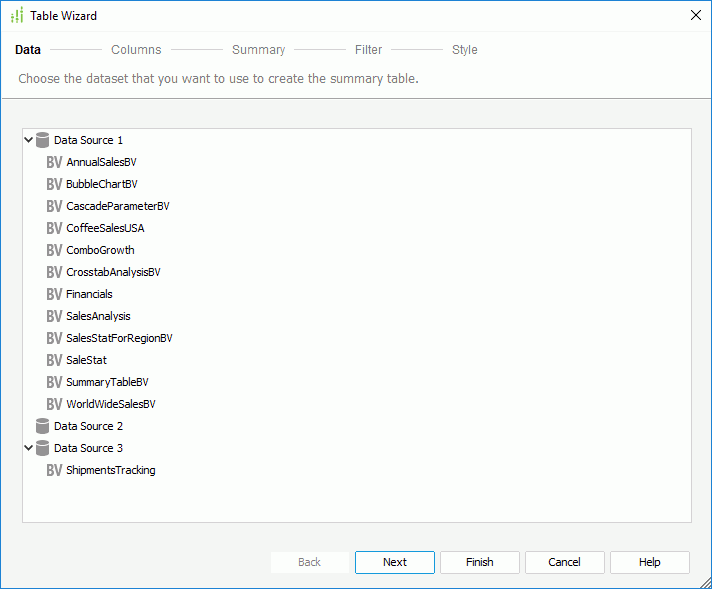 When you use the Table Wizard dialog box to create or edit tables using business views in web reports/library components, Designer displays different screens in the dialog box according to the type of the table: group table or summary table; there is no such difference when you use the dialog box for creating or editing tables in page reports.